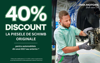 La Avia Motors ai 40% DISCOUNT la piesele de schimb originale Škoda, Volkswagen și SEAT pentru modelele din anul 2017 sau mai anterior.