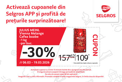 Activează cuponul din Selgros APP cu minim 15 minute înainte de a ajunge la casa de marcat și profiți de extra reduceri doar pentru tine!