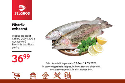 La Selgros ai păstrăv proaspăt eviscerat, calibru 200–350 g, acvacultură România, la prețul de 36,99 lei/kg.
