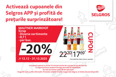 Activează cuponul din Selgros APP cu minim 15 minute înainte de a ajunge la casa de marcat și profiți de extra reduceri doar pentru tine!